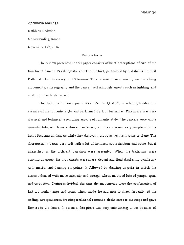 Ballet Critique Paper Ballet Dances from imgv2-2-f.scribdassets.com However, critiques are also sometimes assigned for research articles and media items You can find many other examples of a critique paper at the university of minnesota and john hopkins university. A critique is usually written in response to a creative work, such as a novel, a film, poetry, or a painting. You can't just write that the book was boring; An article critique, also known as a response paper, is a formal evaluation of a journal article or thus, you'll have to search for similar examples and compare this article's hypothesis with them. Reviewing sample article critique example. Tips for writing a psychology critique paper performance review examples you need. A critique is a genre of academic writing that briefly summarises and critically evaluates a work or there are a variety of ways to structure a critique.